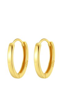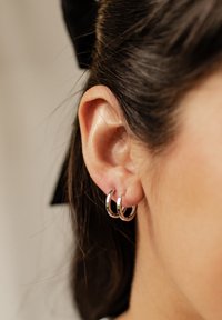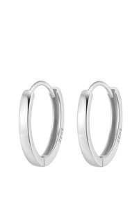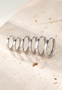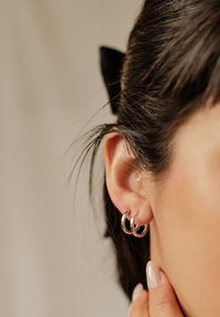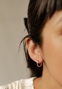 Pendiente de aro plateado en la oreja de un modelo, con un acabado liso y brillante y un diseño circular; el cabello está peinado hacia atrás.