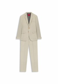 Traje azul claro de tela lisa con chaqueta de un solo botón, solapas con muesca y pantalones a juego, complementado con una camisa blanca y zapatos negros.