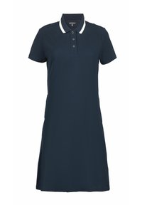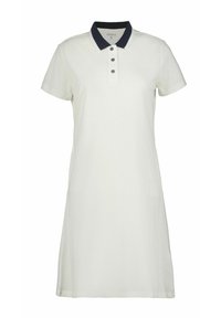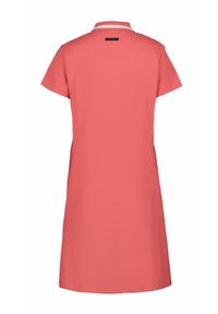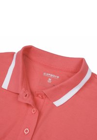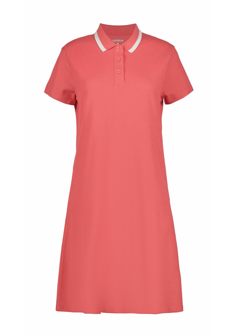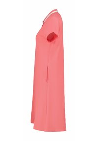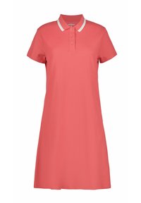 Vestido polo coral con cuello blanco, mangas cortas y corte entallado, confeccionado con una tela suave y transpirable.