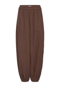 Persona con pantalones negros holgados arrugados con puños y cintura elásticos, combinados con zapatos negros sin cordones y una camiseta blanca.