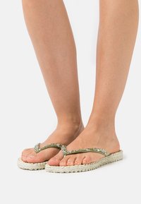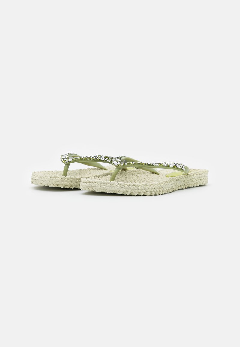 Chanclas tejidas de color verde claro con tiras adornadas con piedras de strass, suela plana y diseño trenzado texturizado sobre un fondo blanco.