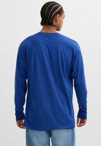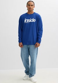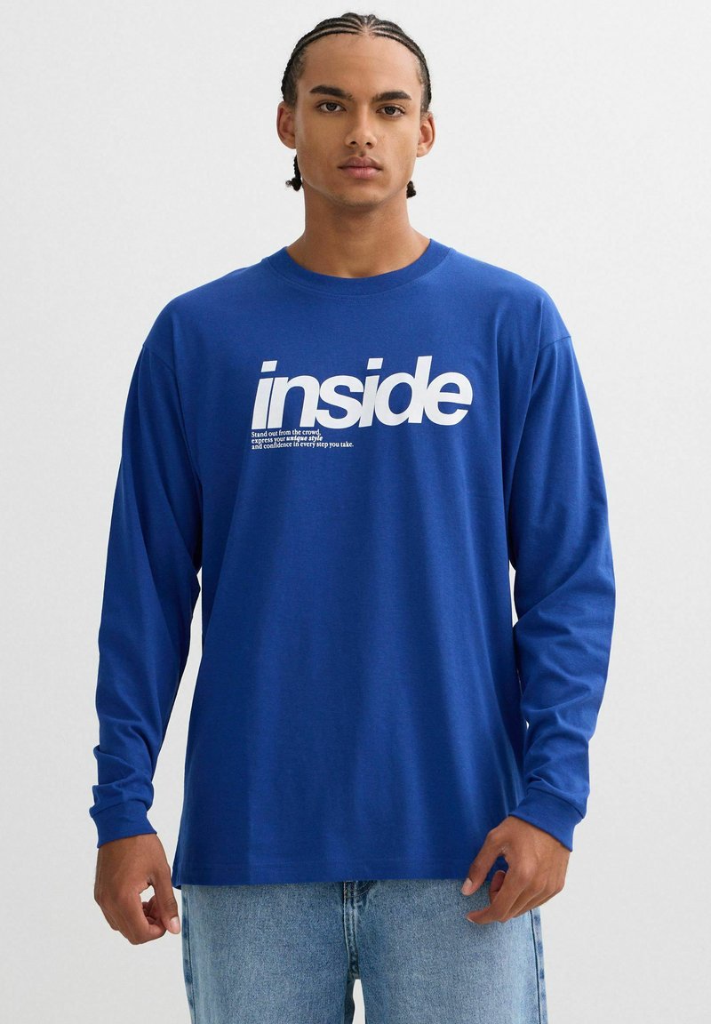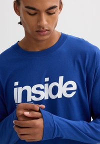 Camiseta de manga larga azul con texto blanco "inside" y texto adicional abajo. Fabricada con tela suave, con un escote redondo y un corte holgado.