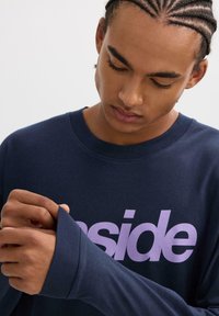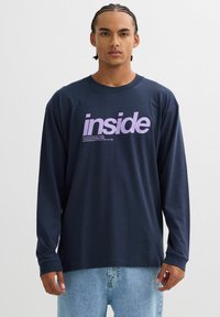 Camiseta de manga larga en color azul marino con un gran gráfico morado de "inside" y texto debajo. Fabricada en tejido suave con un corte holgado y escote redondo.