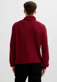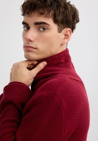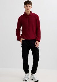 Jersey de punto burdeos con cuello alto, cordón ajustable y puños acanalados. Tejido texturizado con un ajuste holgado.