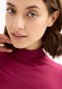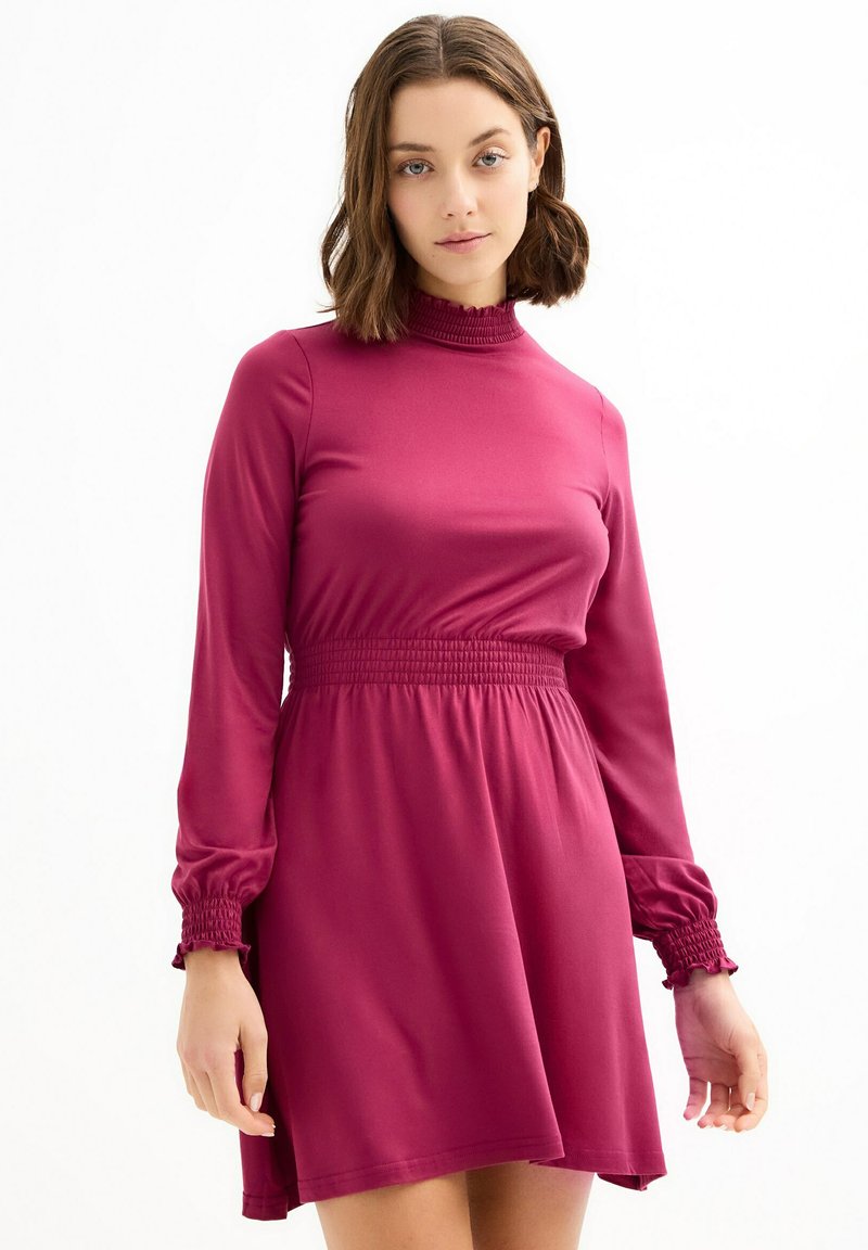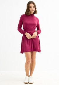 Vestido fucsia de manga larga con cuello alto, cintura fruncida y puños gather. Tela suave y elástica con una falda acampanada.