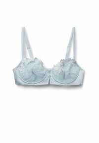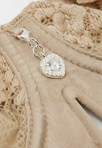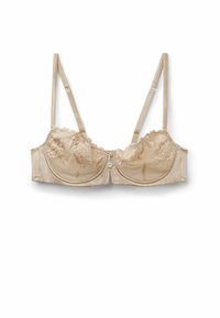 Joven con cabello largo y castaño, vestida con un sujetador de encaje beige, levantando un brazo y tocándose la parte posterior del cuello sobre un fondo neutro.