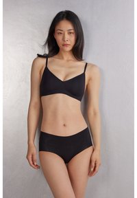 Joven mujer con cabello largo y negro, vestida con un sujetador suave negro y ropa interior negra a juego, de pie frente a un fondo liso gris claro.