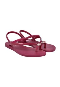 Sandalia plana roja con tira entre los dedos, finas correas diagonales y de tobillo, y suela texturizada, diseñada para uso casual.