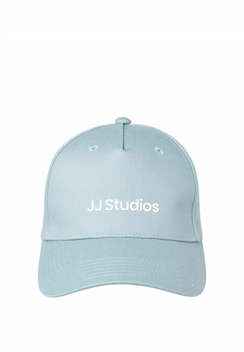 Gorra de béisbol azul claro con corona redondeada y visera rígida, con el texto "JJ Studios" en blanco bordado en la parte frontal.