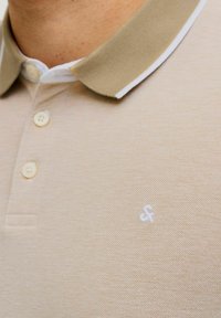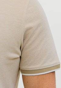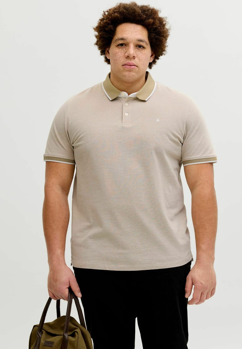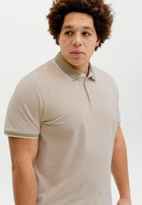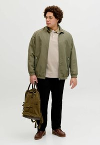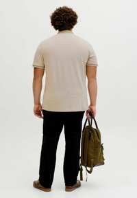Hombre con cabello rizado, vistiendo una camisa polo beige y pantalones negros, sosteniendo una bolsa deportiva verde con asas marrones sobre un fondo liso.