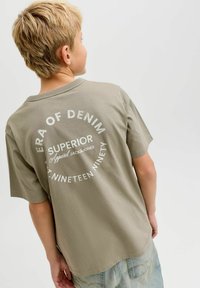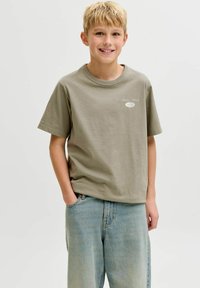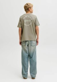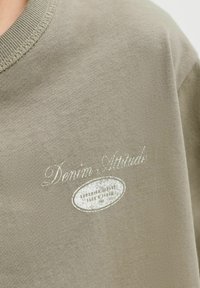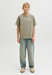 Camiseta verde oliva clara con cuello redondo y mangas cortas, combinada con pantalones vaqueros sueltos azules. Diseño simple sin patrones visibles.