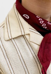 Adolescente vestido con camisa de manga corta con botones y rayas crema, pantalones cortos a juego, calcetines blancos, zapatillas deportivas y un pañuelo rojo atado alrededor del cuello.