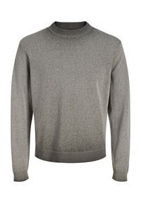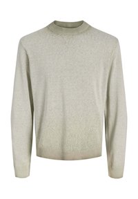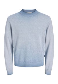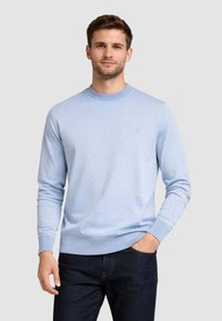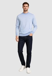 Hombre con un suéter azul claro de cuello redondo y vaqueros oscuros, de pie con una mano en el bolsillo frente a un fondo liso.