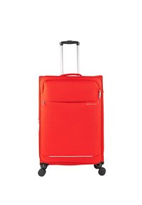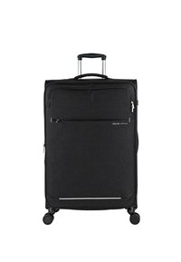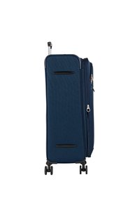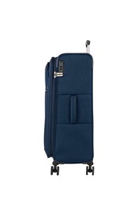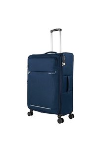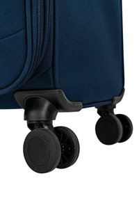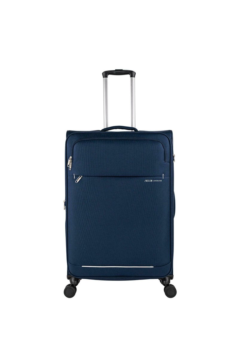 Maleta azul marino con superficie texturizada, detalles de cremallera plateada, asa retráctil y cuatro ruedas giratorias para facilitar la movilidad.