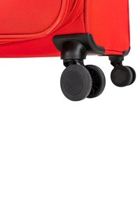Dos maletas blandas rojas con cuatro ruedas giratorias negras, asas telescópicas, bolsillos frontales con cremallera y asas laterales para llevar, sobre fondo blanco.