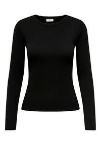 Top de manga larga de color azul claro con textura acanalada, combinado con jeans de tiro alto en azul claro y un cinturón negro con hebilla rectangular.