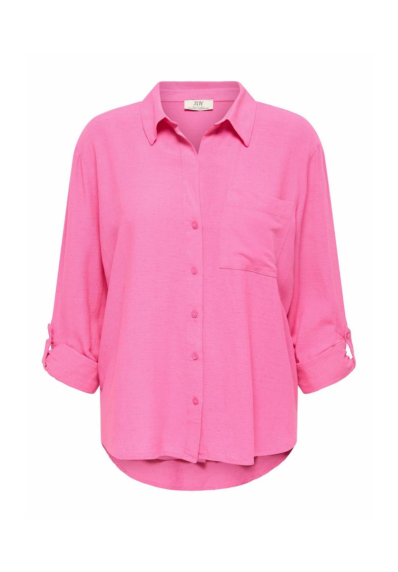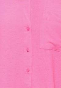 Camisa de manga larga de color rosa brillante con botones, cuello, bolsillo en el pecho y mangas remangadas aseguradas con pestañas de botón.