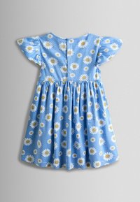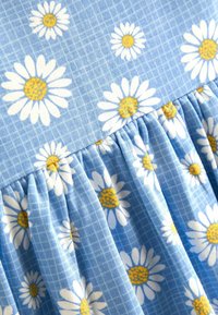 Vestido de cuadros vichy azul con margaritas blancas, mangas cortas con volantes y cintura fruncida. Tela ligera con textura suave y estampado floral.