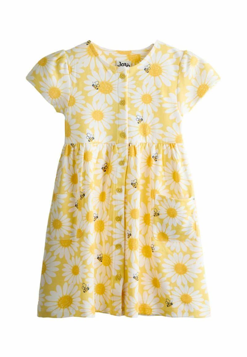 Vestido amarillo de manga corta para niño pequeño con margaritas blancas y pequeñas abejas, cierre frontal de botones y dos bolsillos delanteros.