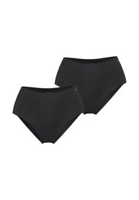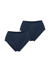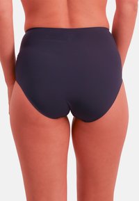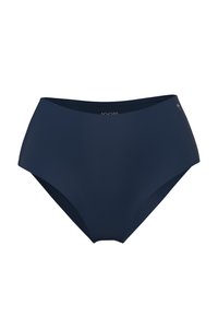 Braguita de baño de talle alto en azul marino, hecha de una tela suave, con un pequeño detalle de logo dorado en la cintura.