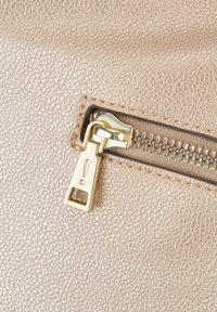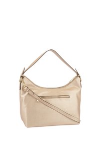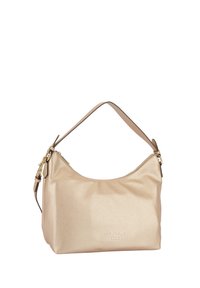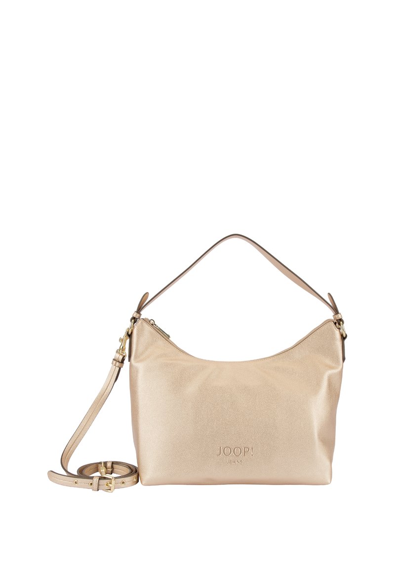 Bolso de hombro de cuero beige claro con herrajes dorados, cierre de cremallera, logotipo en relieve "JOOP! JEANS" y correa ajustable y desmontable.