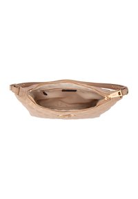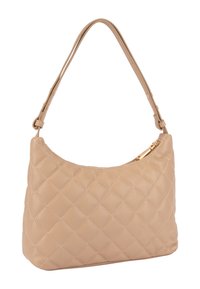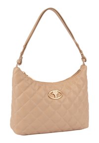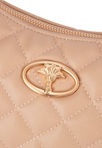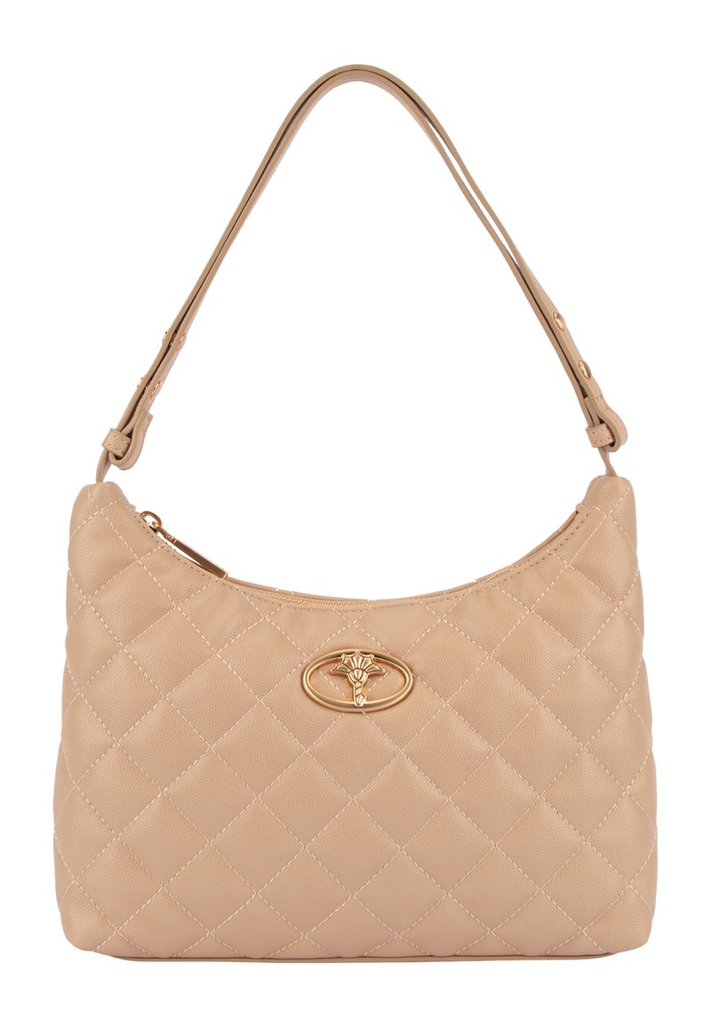 Bolso beige acolchado con una correa de hombro ajustable y un emblema floral dorado en el centro frontal.
