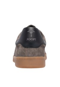 Zapatilla baja de ante gris con suela de goma color caqui, detalle en el talón negro, perforaciones laterales, cierre de cordones y marca "JOOP!" en el lateral.