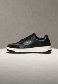 Zapatilla baja negra con suela blanca, cordones en la parte delantera, paneles de cuero texturizado y logotipo "Just Cavalli" en el lateral.