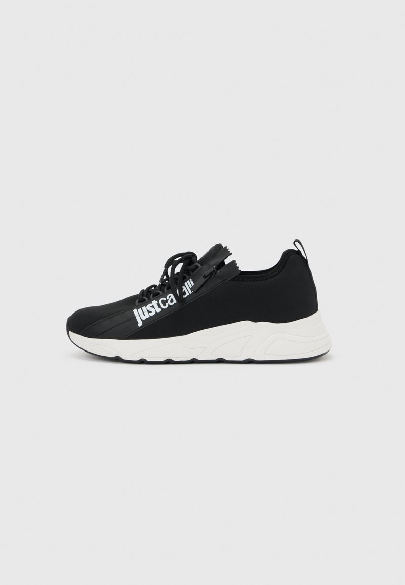Zapatilla negra con suela blanca, cremallera lateral parcialmente abierta, texto de marca "Just Cavalli" en blanco en el costado superior.