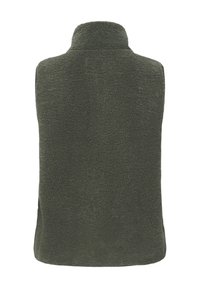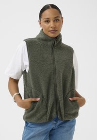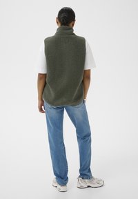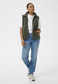 Mujer con chaleco de forro polar verde oliva con cremallera, encima de una camiseta blanca de manga corta, con las manos en los bolsillos del chaleco, combinando con jeans azules.