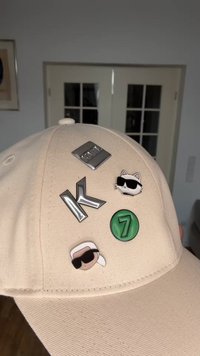Gorra de béisbol de algodón color beige claro con visera curvada, que presenta varios parches pequeños coloridos y bordados en la parte frontal.
