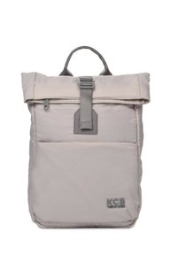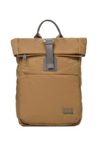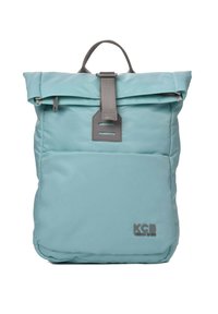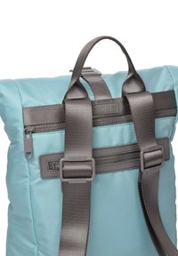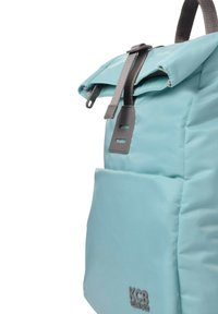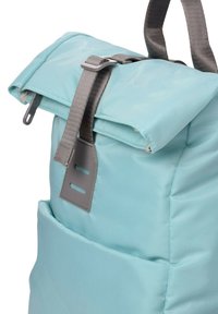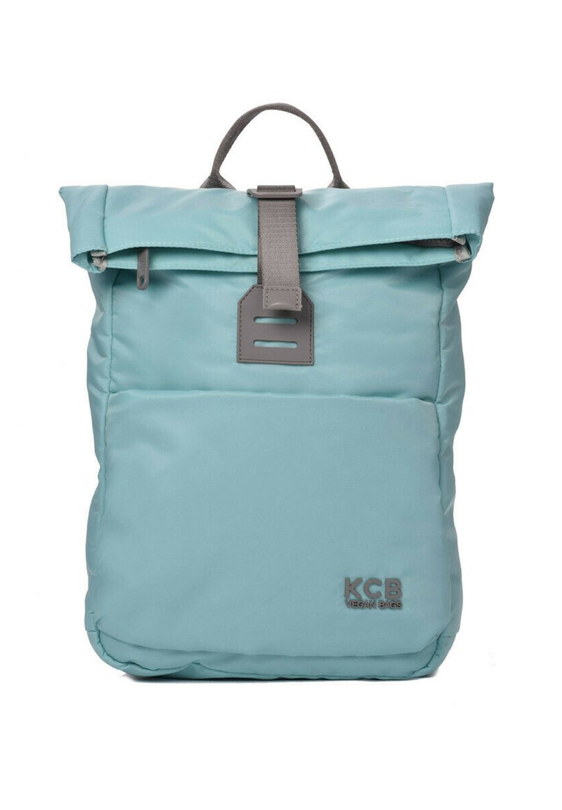 Mochila azul con tapa enrollable, hecha de material suave y resistente al agua. Cuenta con un cierre de hebilla gris y un logo en la parte frontal inferior.