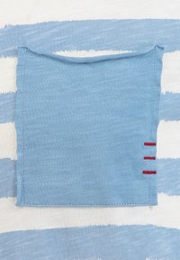 Camiseta de manga corta con rayas horizontales en azul claro y blanco, con un bolsillo en el pecho de color azul claro sólido.