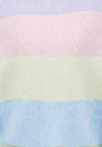 Suéter acanalado multicolor con rayas horizontales en lavanda, rosa, amarillo pálido, azul y verde menta, con un escote redondo y mangas largas.