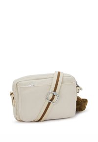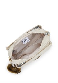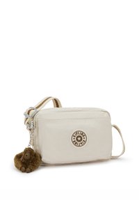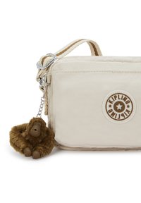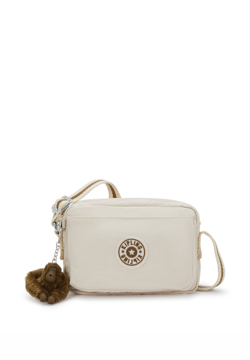 Bolso cruzado color crema hecho de tela suave con cierre de cremallera, presenta un parche de logo redondo y un llavero de mono marrón.