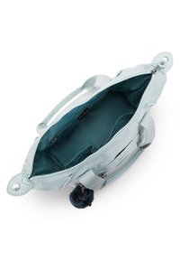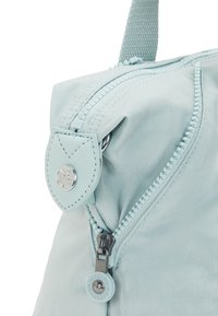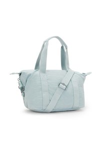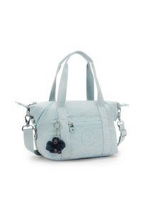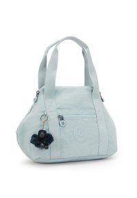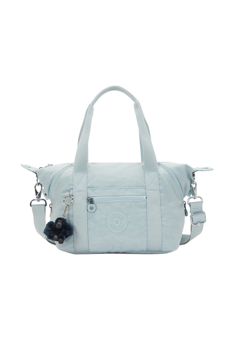 Bolsa de tela azul claro con dos asas y una correa de hombro desmontable. Cuenta con un bolsillo delantero con cremallera y un colgante con una figura de mono.