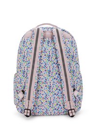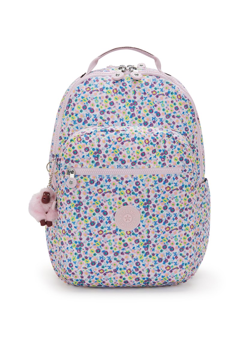 Mochila con estampado floral en tonos rosa y azul, que cuenta con un bolsillo delantero con cremallera, compartimento principal y un llavero de peluche de animal adjunto.