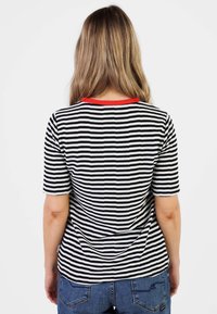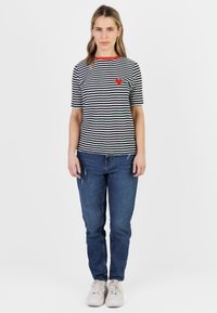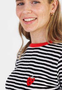 Mujer con cabello rubio que lleva una camiseta de rayas blancas y negras con un emblema de corazón rojo y cuello rojo, combinada con jeans azules.