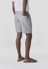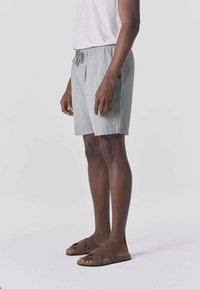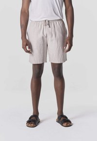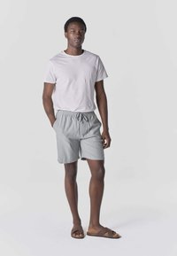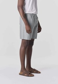 Persona con pantalones cortos gris claro con cordón, camiseta blanca sin mangas y sandalias marrones de tipo slide, de pie contra un fondo liso.