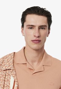 Polo de color melocotón claro con cuello plano y mangas enrolladas, hecho de una tela suave, que presenta un pequeño logo bordado en el pecho.