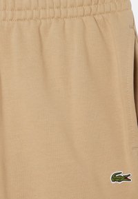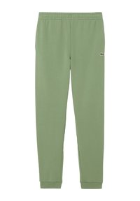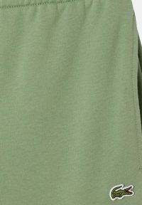 Pantalones deportivos de algodón verde con un corte slim, que cuentan con bolsillos laterales y un logo de Lacoste. Combinados con zapatillas blancas con detalles en negro.