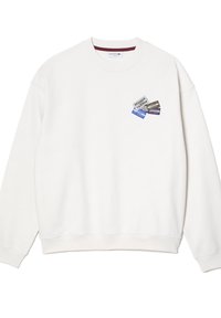 Sudadera blanca con escote redondo y puños de canalé. Presenta un parche impreso colorido en el pecho con varios diseños gráficos.