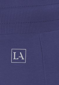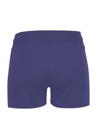Top corto negro y pantalones cortos morados con cordón, junto con zapatillas blancas. El modelo se presenta de lado, mostrando un ajuste atlético y un diseño casual.