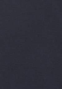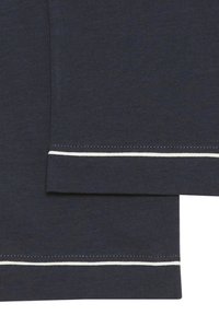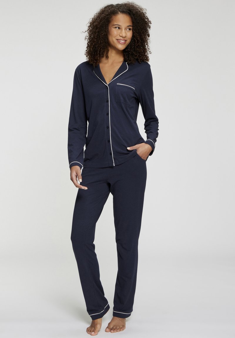 Mujer de pie descalza vistiendo un conjunto de pijama azul marino de manga larga con ribetes blancos, sonriendo y mirando hacia un lado con una mano en el bolsillo.