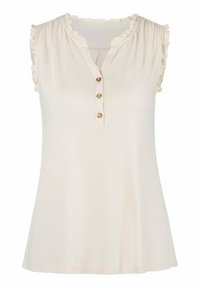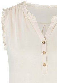 Top sin mangas color beige claro con un cuello con volantes y una tapeta de tres botones, combinado con un cinturón marrón con tachuelas y jeans oscuros.