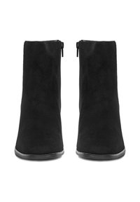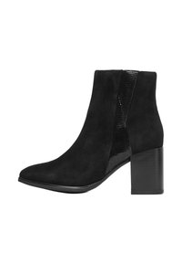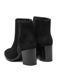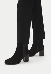 Botines de ante negro con tacón cuadrado, que cuentan con paneles laterales elásticos y una cremallera lateral. Textura suave y diseño de punta redondeada.
