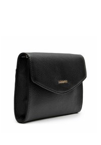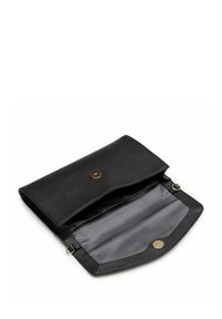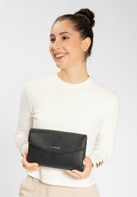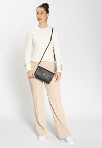 Top largo blanco de manga larga, pantalones beige ajustados y bolso cruzado negro con herrajes dorados, de pie contra un fondo blanco liso.