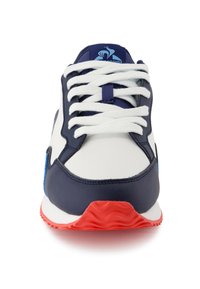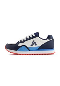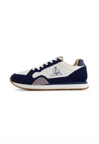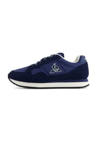 Zapatillas deportivas en azul marino y blanco con un acento azul; cuentan con una suela de goma texturizada, superficie lisa y detalle del logo en el lateral.