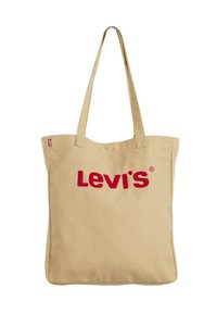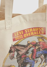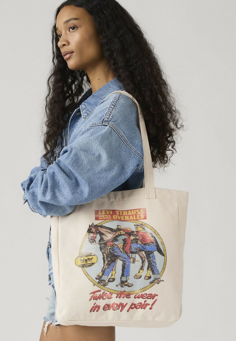 Joven con cabello rizado que lleva una chaqueta vaquera y un bolso tote beige con un gráfico vintage de Levi’s y texto.