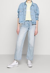 Persona con una camiseta verde claro de Levi's con logo blanco y vaqueros de mezclilla azul claro de cintura alta, de pie frente a un fondo liso.
